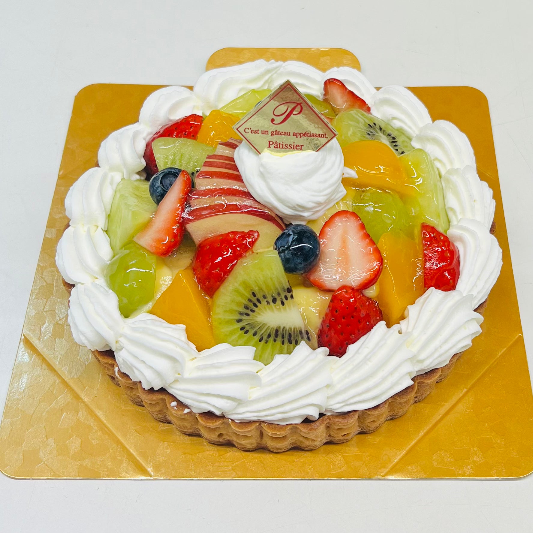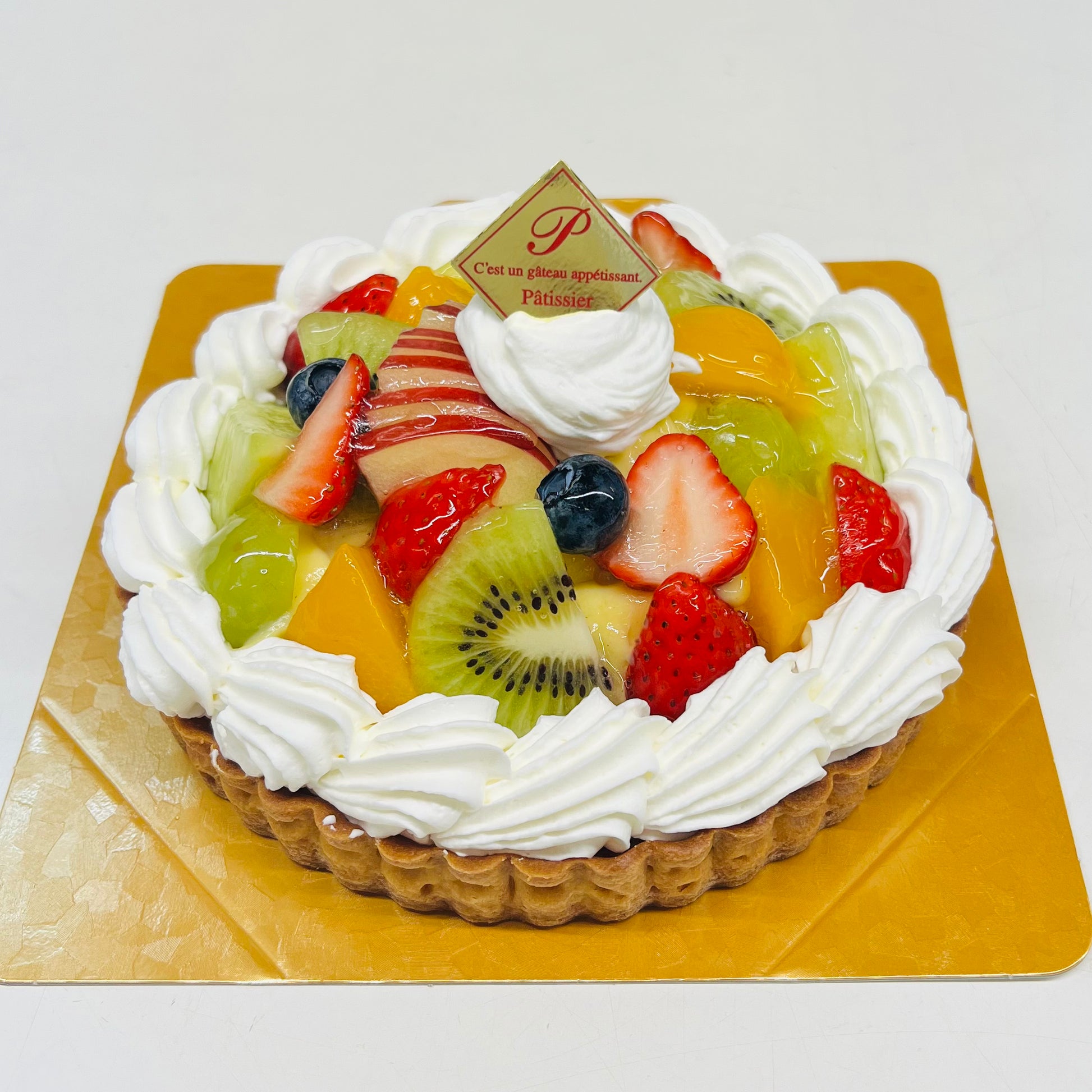 お誕生日や記念日に。香ばしく焼き上げたタルト生地に、なめらかなカスタードクリームをたっぷりと敷き詰め、みずみずしい季節のフルーツを贅沢に飾りました。フルーツの甘みと酸味がクリームと調和し、サクサクのタルトとともに口いっぱいに広がる贅沢な味わいをお楽しみください。